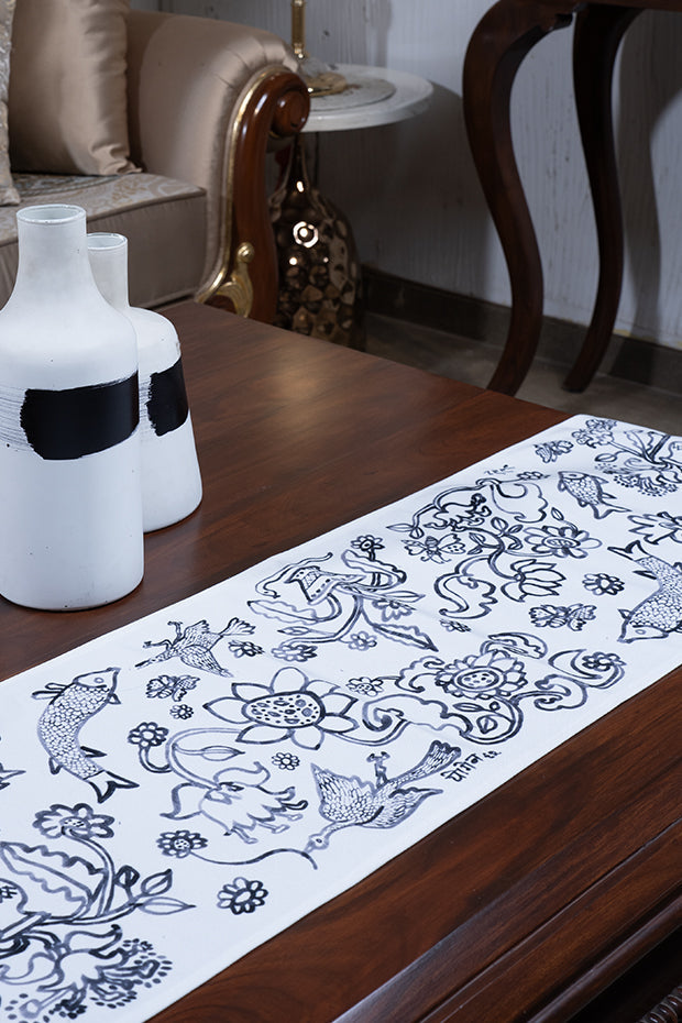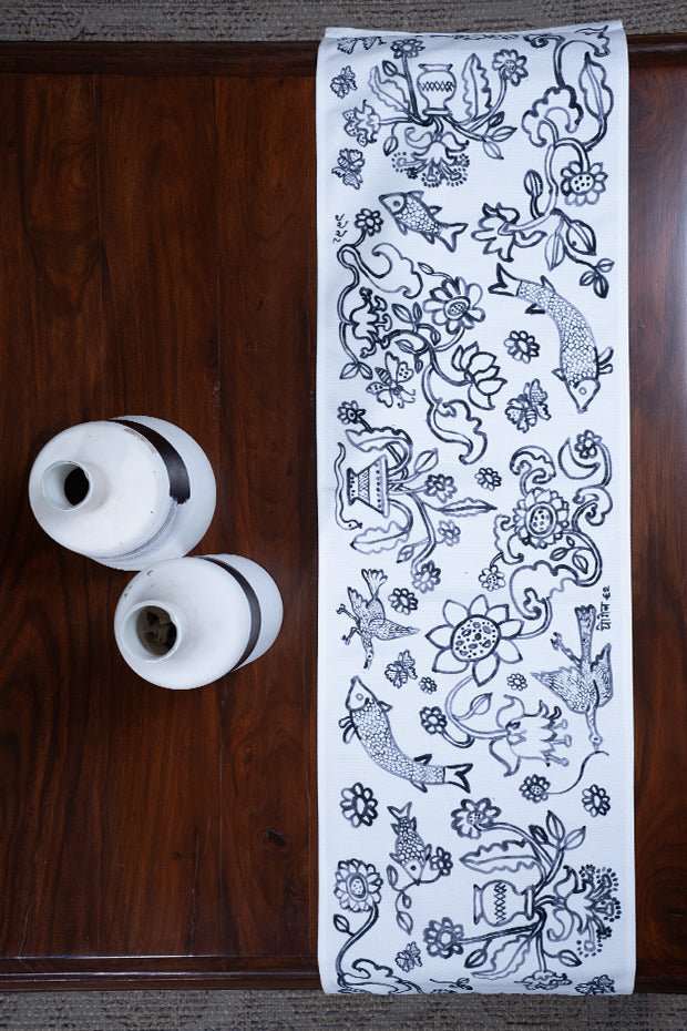 A table runner featuring fish motifs, bringing folk-inspired charm to your dining table.