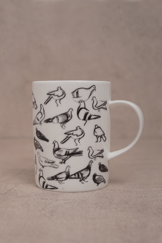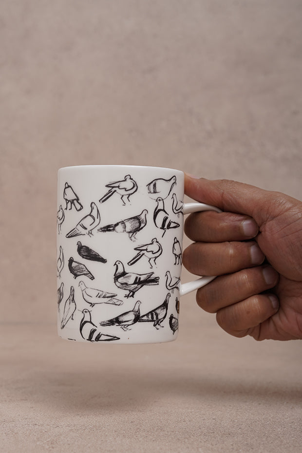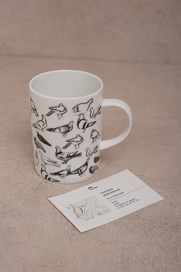Inspired by the delicate line drawings of N. N. Mohandas, this mug translates the quiet poetry of his sketchbook works into a functional everyday object. The minimal black-and-white illustration of pigeons captures movement and rhythm, making each sip feel calm and contemplative.