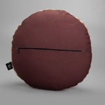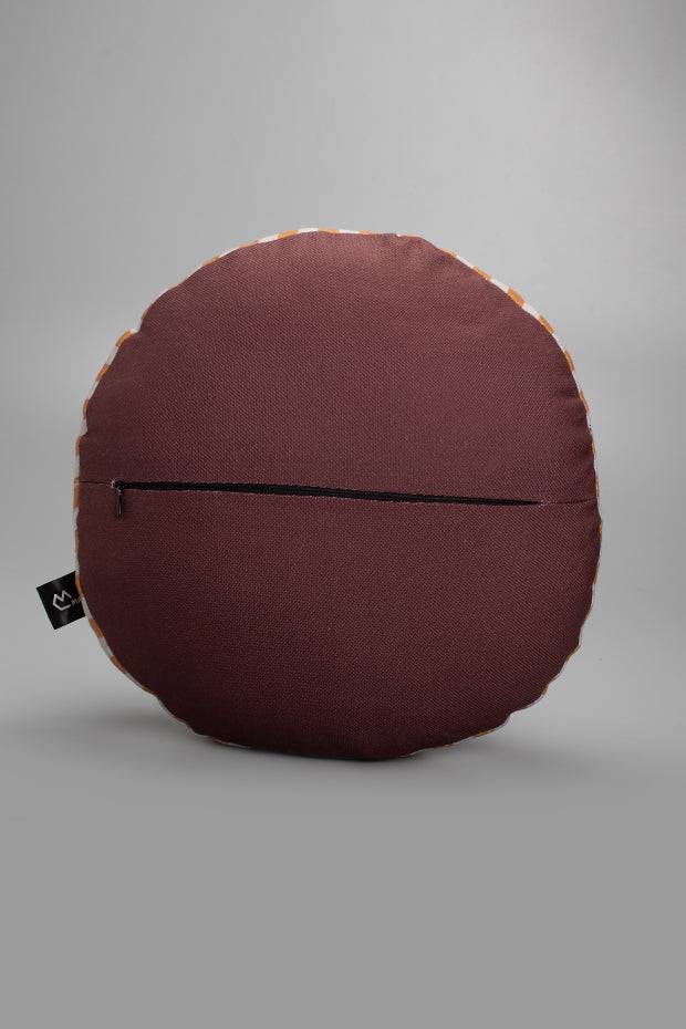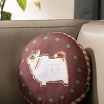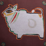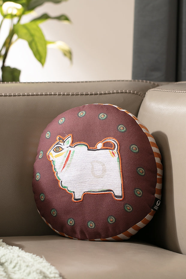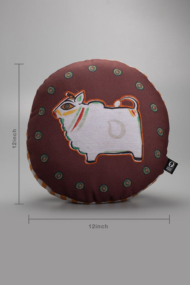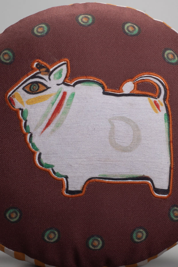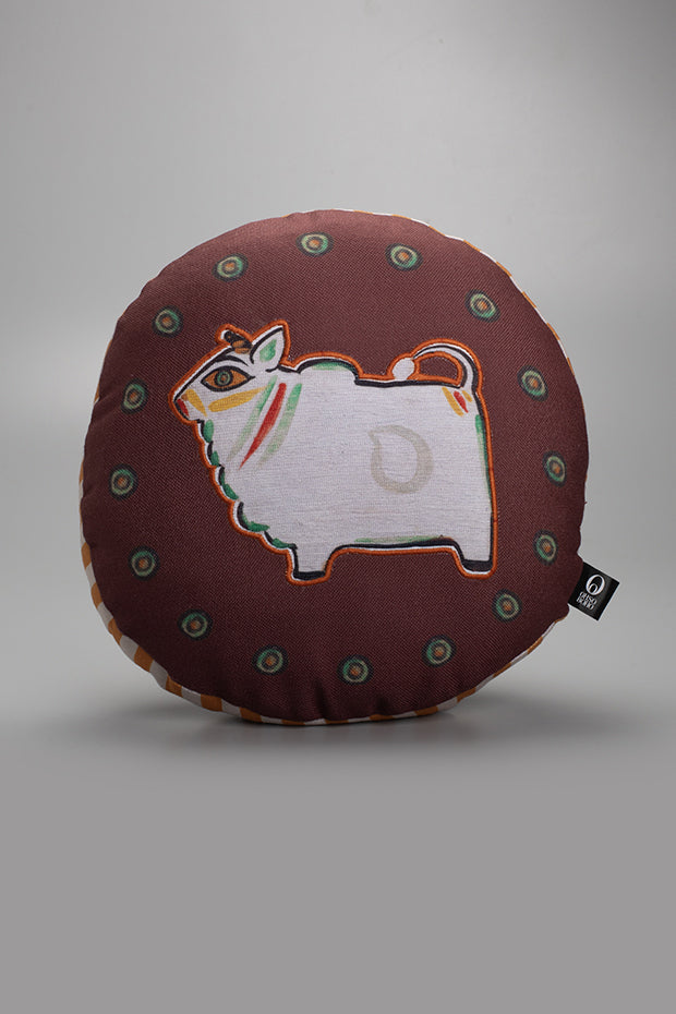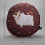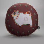 Round cushion featuring Jamini Roy’s cow motif in brown, bold and cultural.