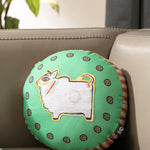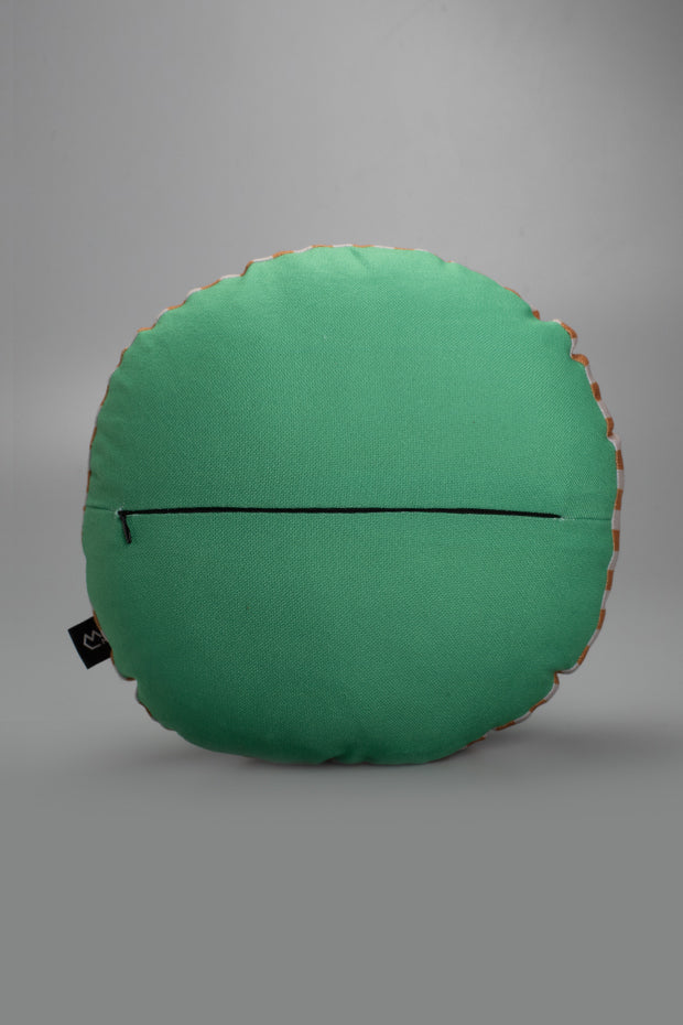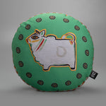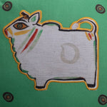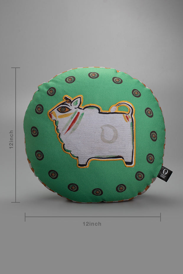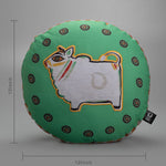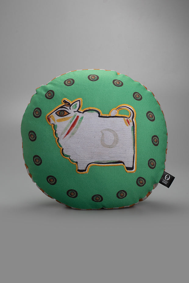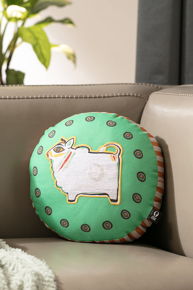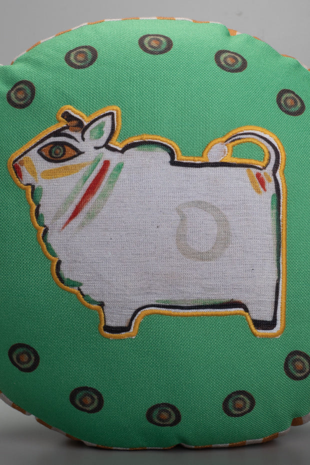 Round cushion with Jamini Roy’s cow motif in green, bold and playful.