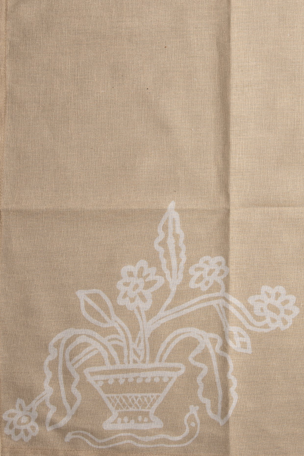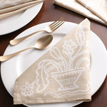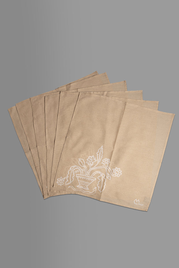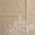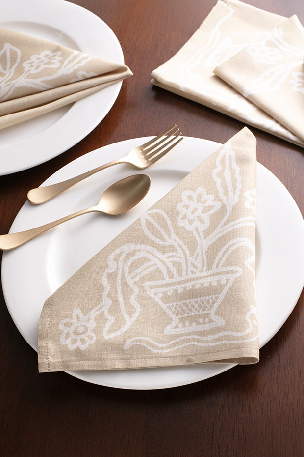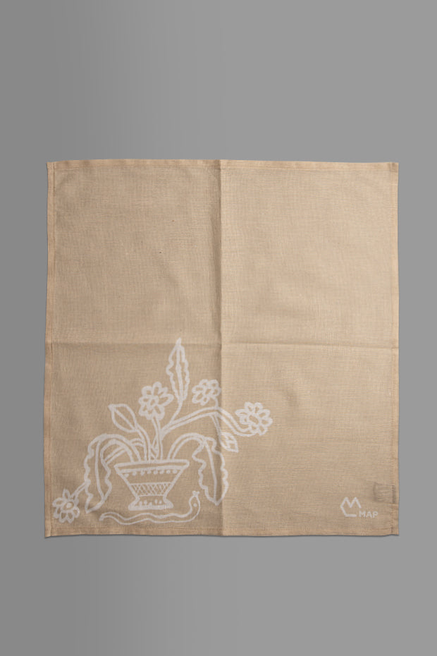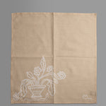 A napkin with Jogen’s vase artwork on off-white fabric, elegant for dining.