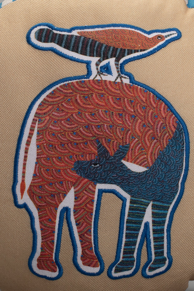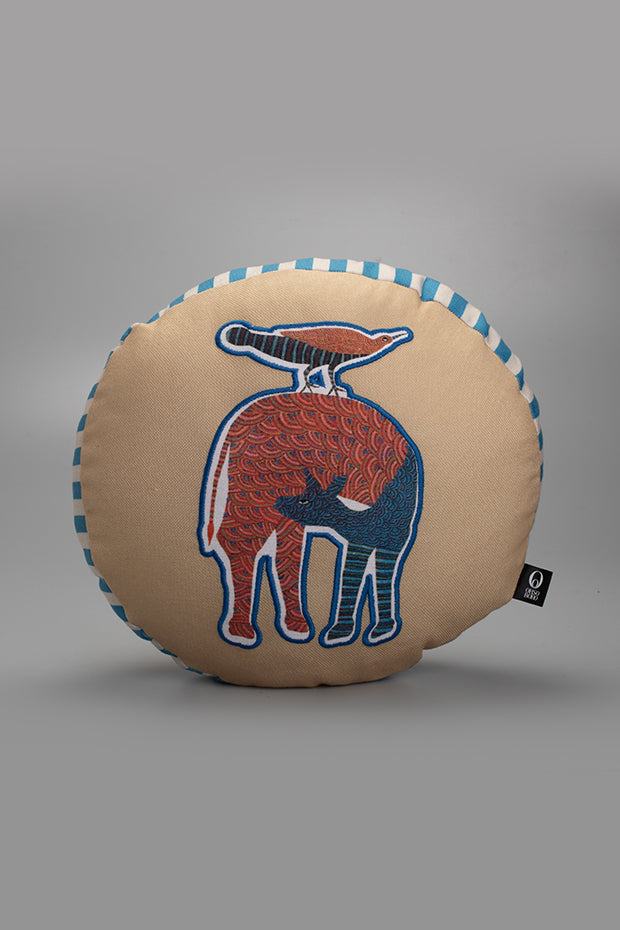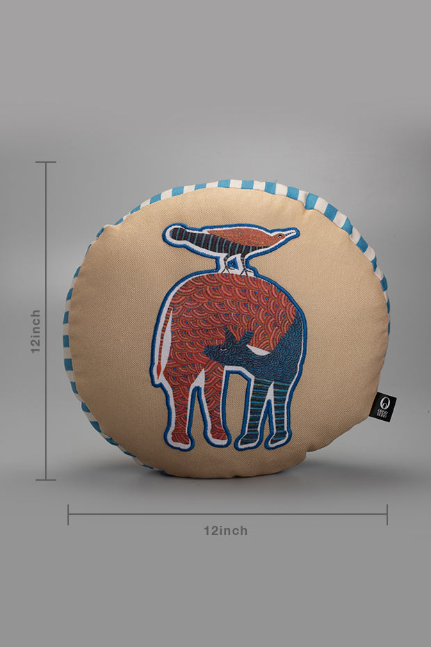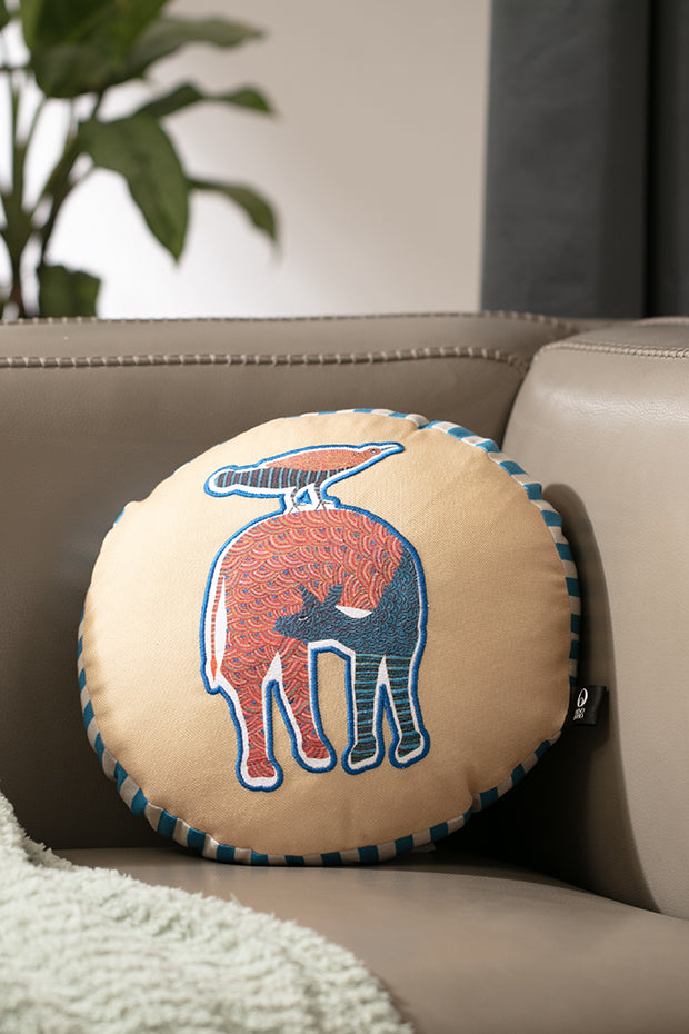 Nankushiya peach-toned cushion showcasing vibrant tribal artistry with earthy charm.