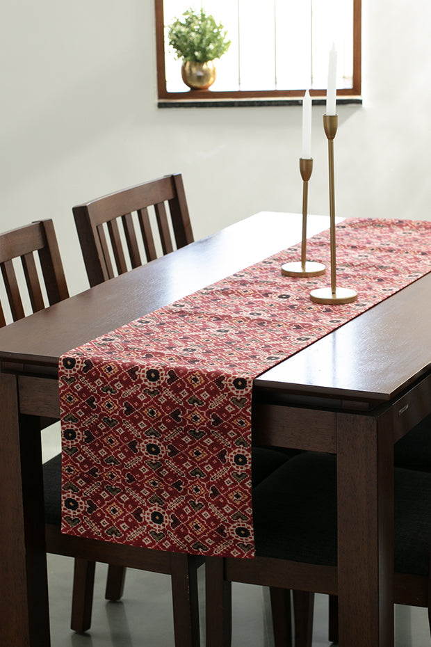 A table runner featuring Patola textile designs, celebrating heritage craftsmanship.