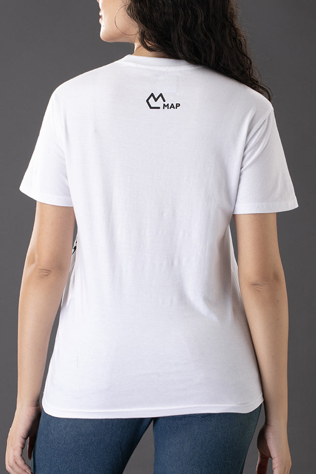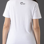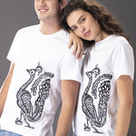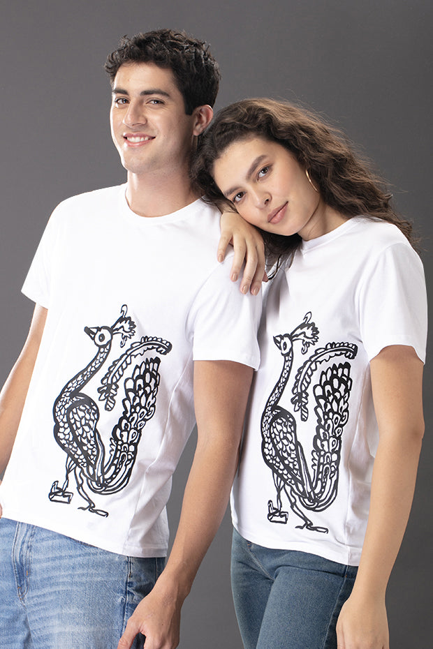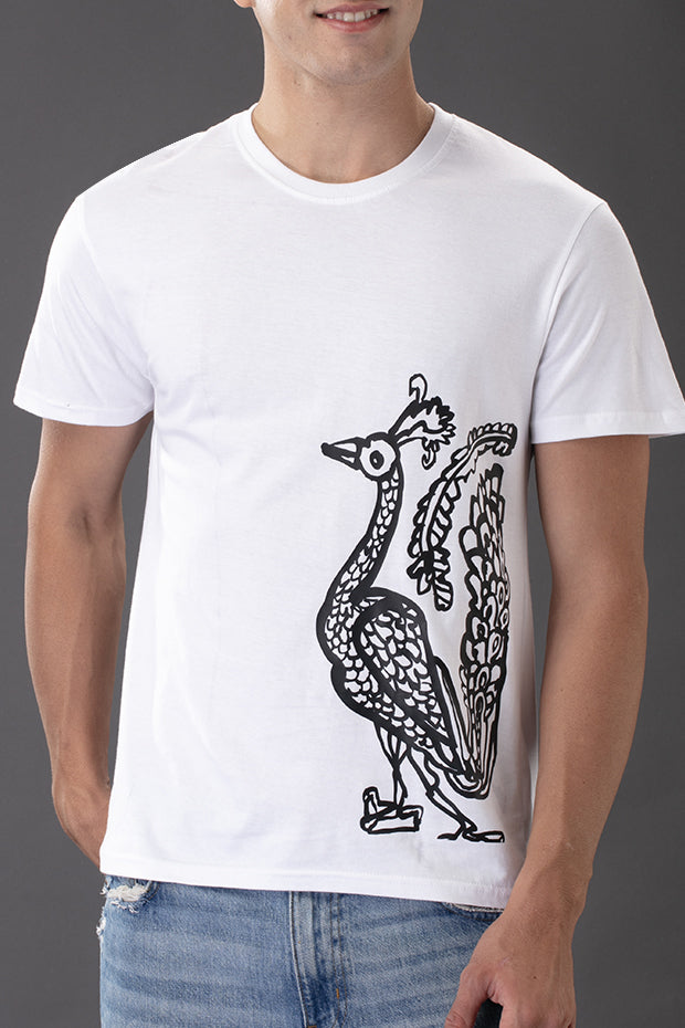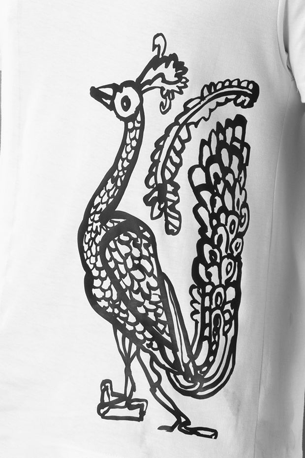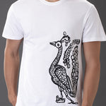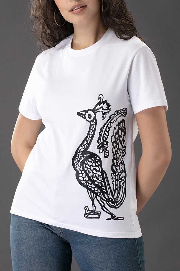White T-shirt with peacock artwork, elegant and timeless with a cultural touch.