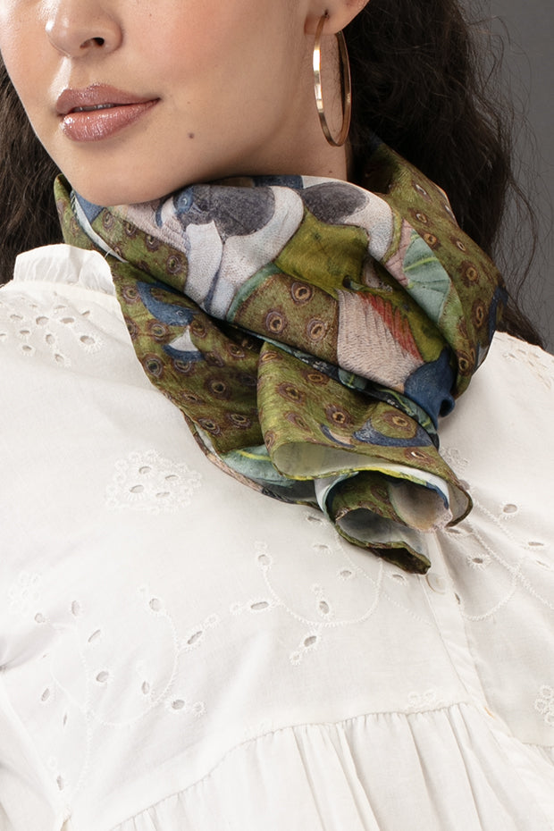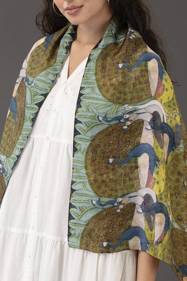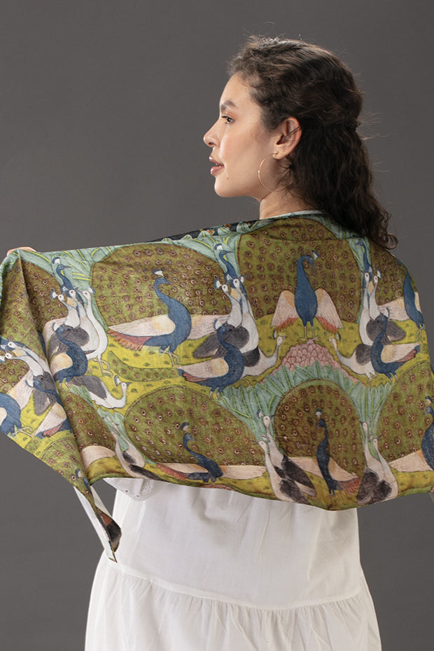 Pichwai Peacock Silk Stole S, elegant silk stole with divine motifs.