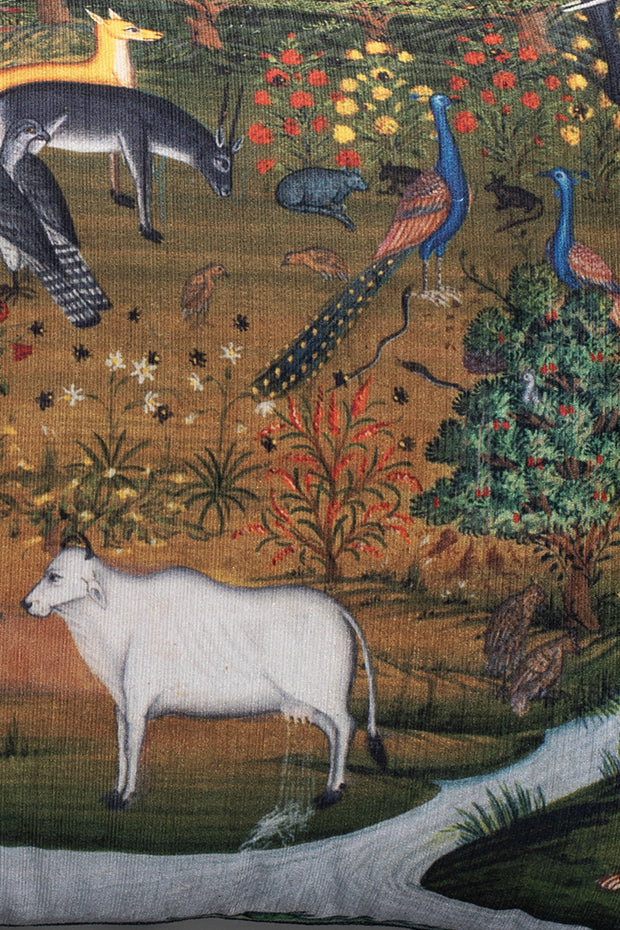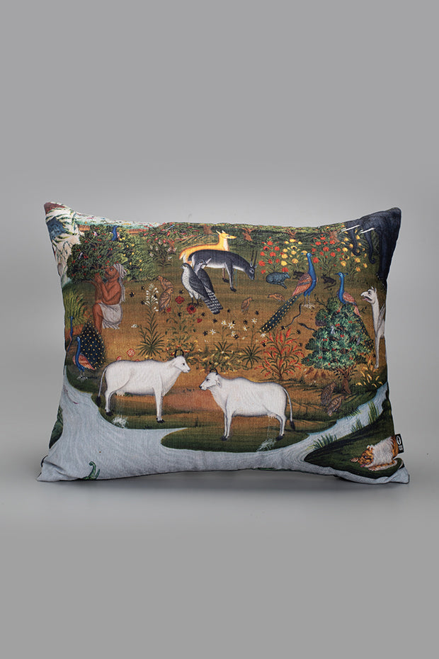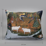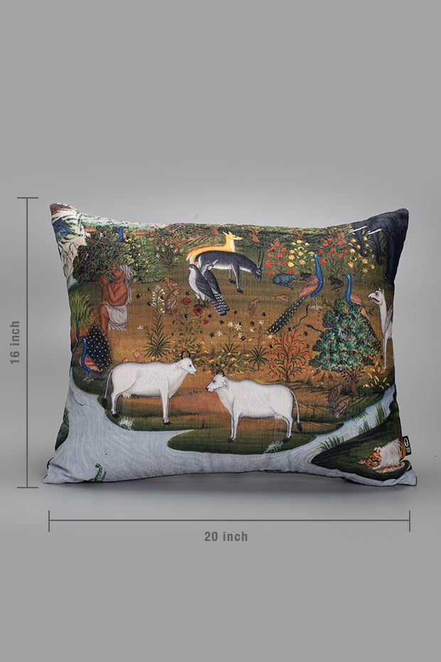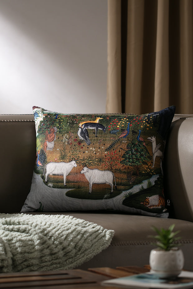 Inspired by the Ramayana, this rectangular cushion narrates epic tales through artistic motifs.