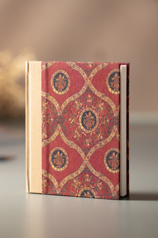 Inspired by the vibrant visual tradition of Pichwai painting, this fabric-covered notebook brings together colour, pattern, and everyday functionality. The rich red base enhances the intricate motifs, making it a striking companion for journaling, note-taking, or sketching.